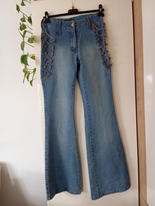 Lepo ohranjene, raztegljive, v pasu merijo 33 do cca 36cm, od razkoraka do pasu je 23cm, dolžina je 110cm, širina spodnjega roba je 28cm, ne menjam, ptt ni vključena v ceno