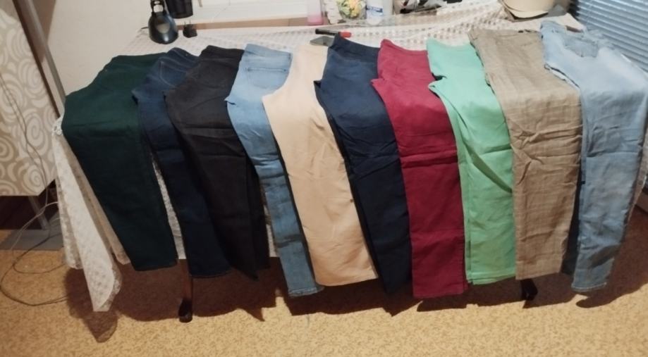 Prodajam komplet 10 kosov rabljenih ženskih hlač v velikosti 38 v različnih barvah. Med hlačami so kavbojke različnih modelov, vključno z Marivy visokimi skinny hlačami in Alexa Tom Tailor hlačami. Vse hlače so v dobrem stanju.