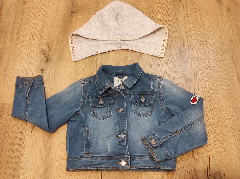 Jeans jakna, baby center, velikost piše 110, a je večja, lepa, frajerska, odstranljiva kapuca