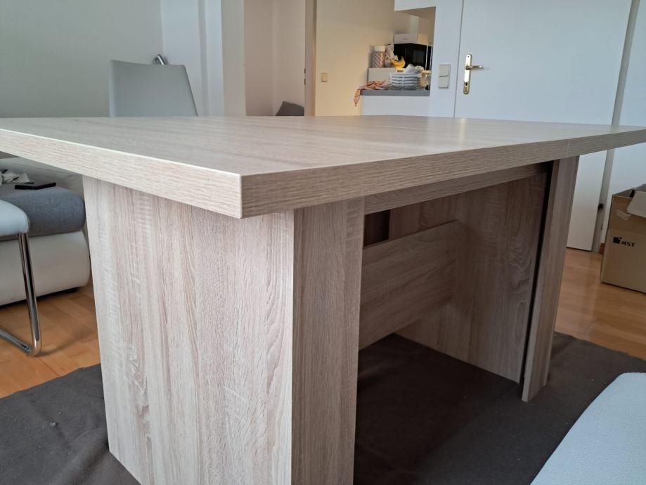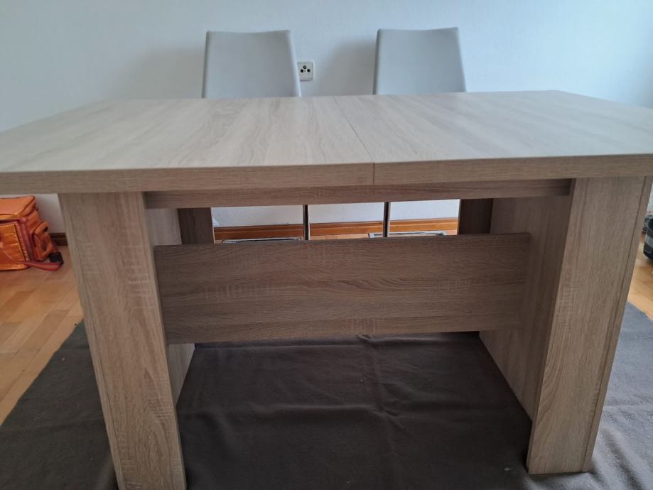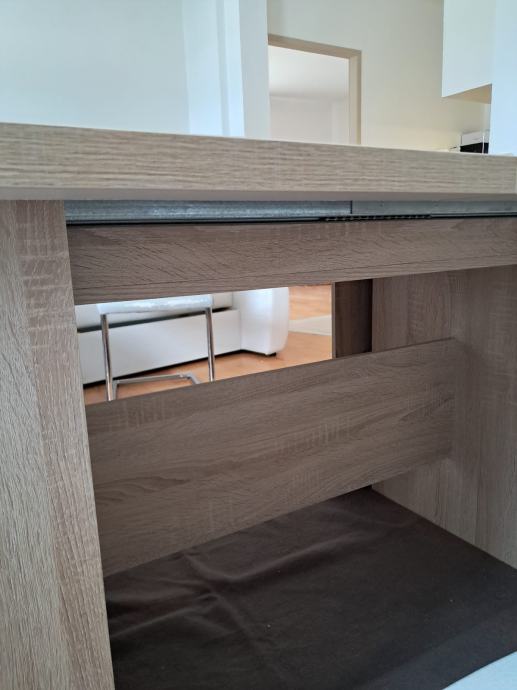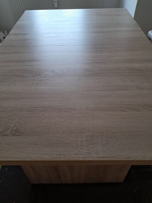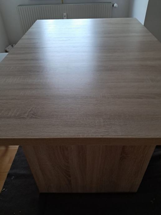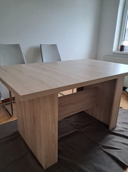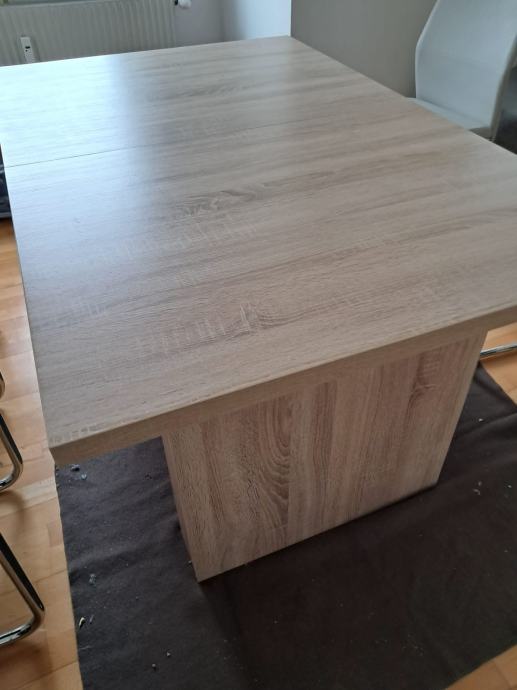 Prodam odlično ohranjeno, res kot novo, raztegljivo mizo v barvi sonoma hrast. Miza je v osnovi dolga 140cm in široka 90cm, se pa lahko 4x podaljša po 40cm in tako doseže maksimalno dolžino treh metrov. Miza je zelo masivna, trdna in ima kovinsko platformo-mehanizem za podaljšanje. Miza je brez poškodb, brez prask, prodaja se zaradi selitve v manjše stanovanje. Poleg so tudi navodila za sestavo, miza je razstavljena, pripravljena za transport. Kupljena je bila v Lesnini, cena tudi po dogovoru.