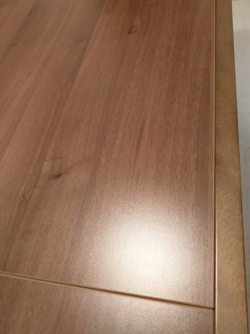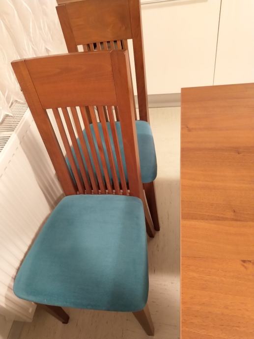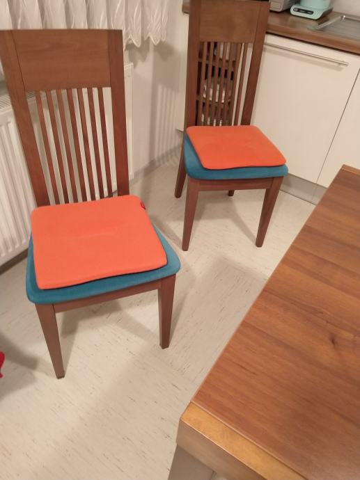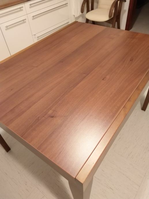 Kupljena 2014. leta. Zelo ohranjena. Masivni bukov les barvan na oreh, zgornja plošča furnir. Zraven lahko dam masivne stole, 30 EUR na en stol.
