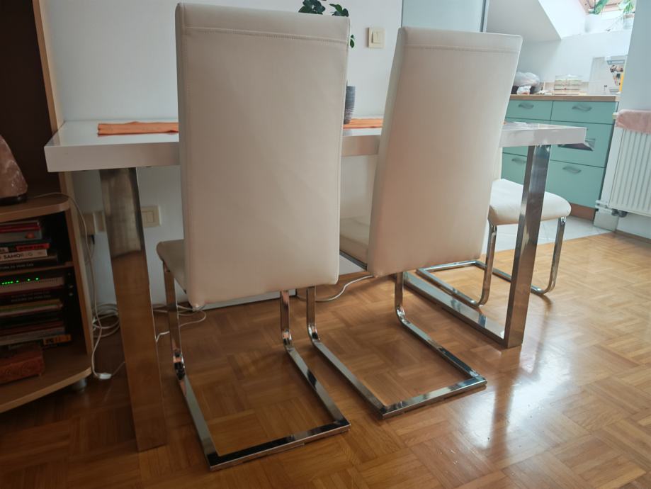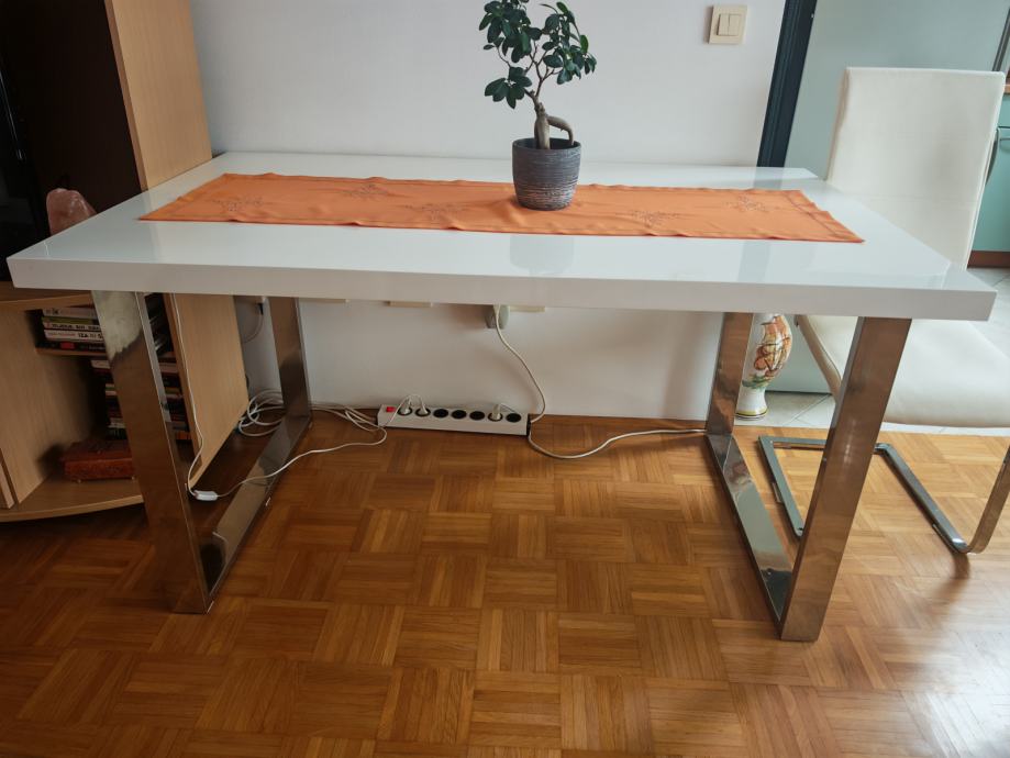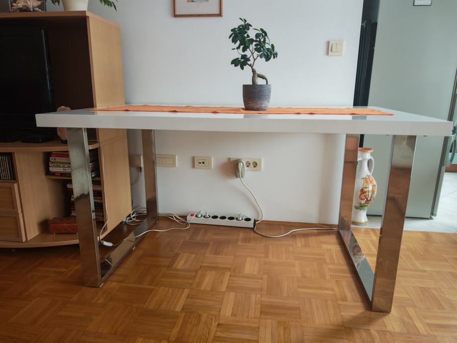 Prodamo jedilno mizo dimenzij 150/90 cm z inox podstavkom in jedilno ploskvijo lakirano v visokem sijaju. Miza je praktično kot nova, brez poškodb. Cena je 50 €. Če želite, so zraven na voljo tudi trije stoli, ki se stilsko ujemajo z mizo po ceni 10 €/kos.