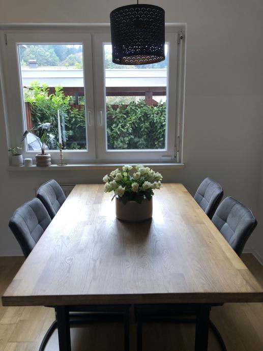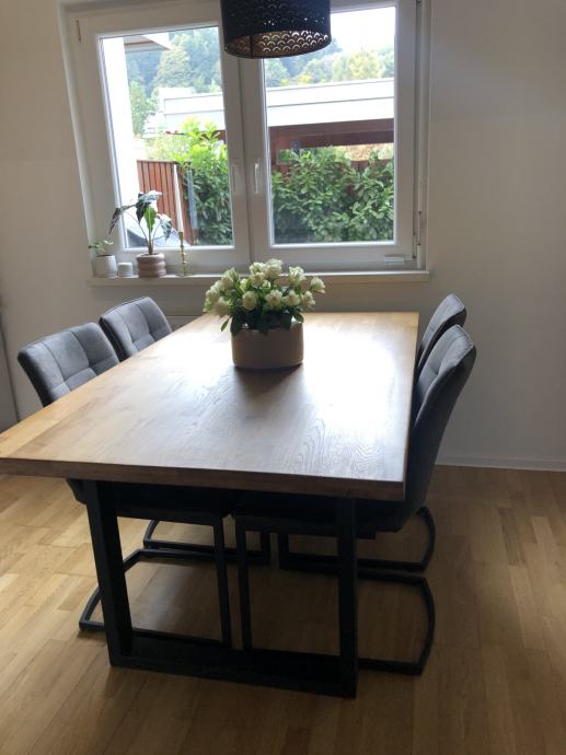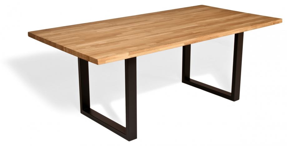 Jedilna miza narejena iz črnih kovinskih nog in plošče iz oljenega hrasta.