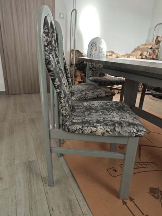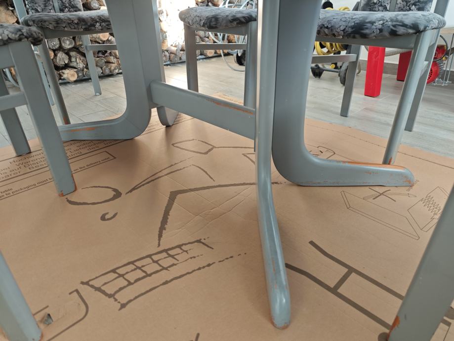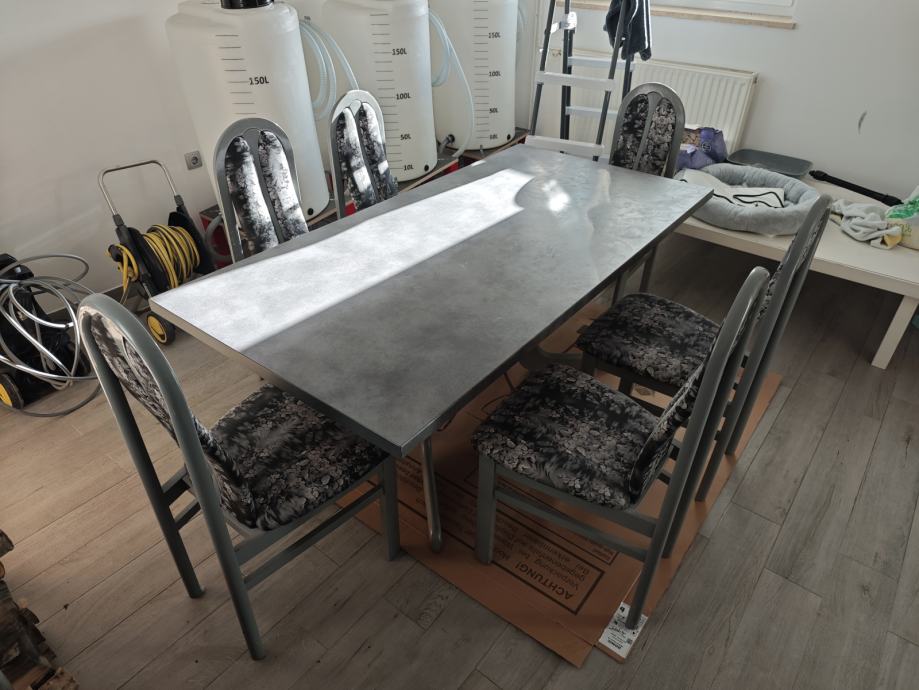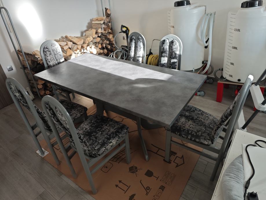 Jedilna miza v antracit barvi. Plošča brezhibna. Barva na nogah stolov in mize ni v popolnem stanju.