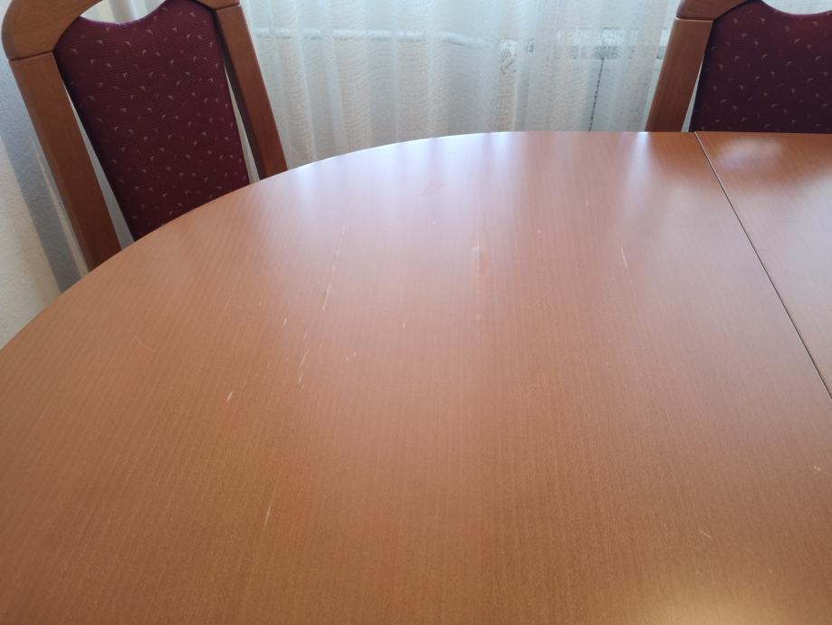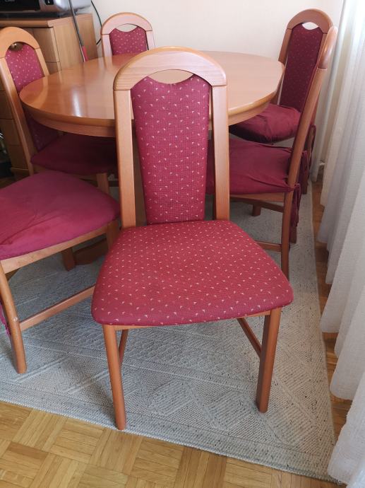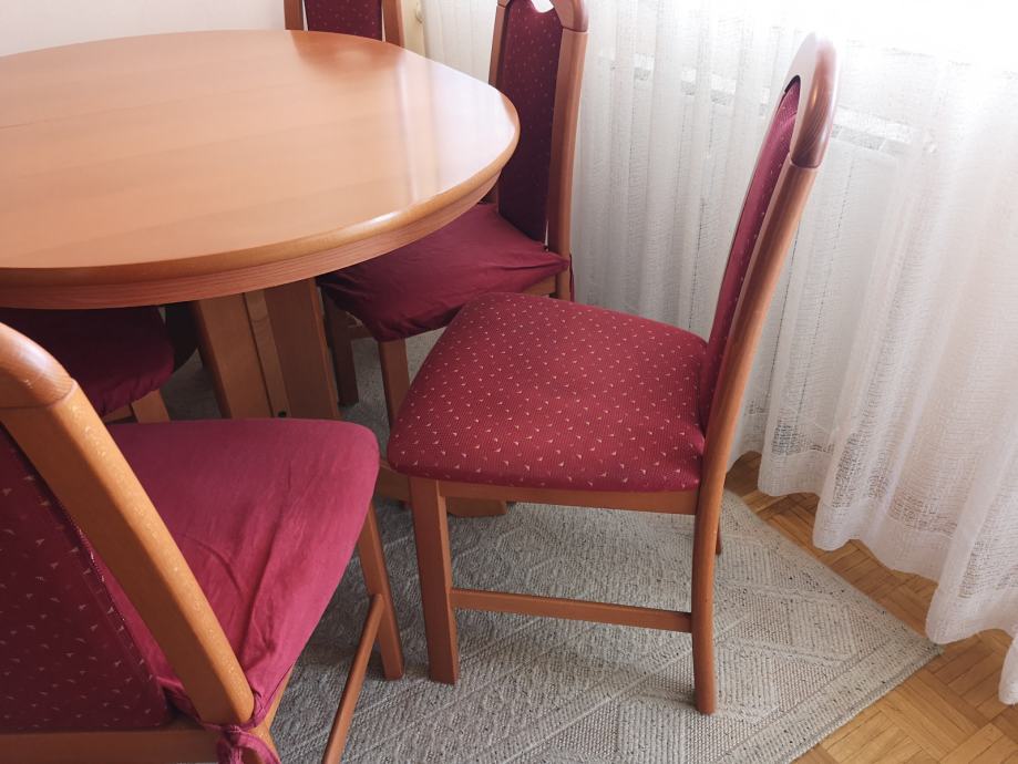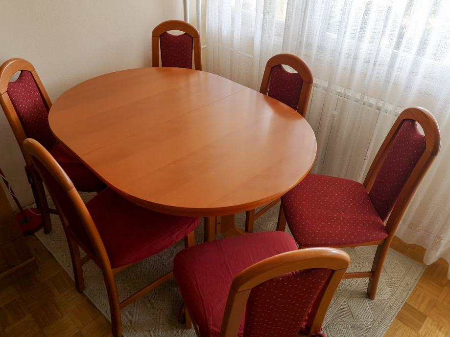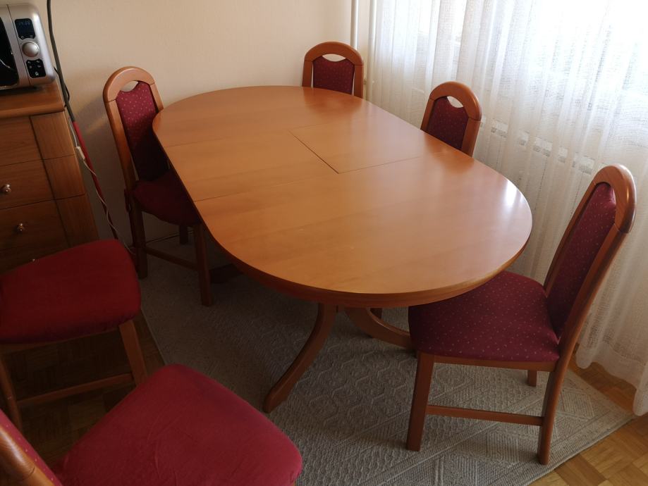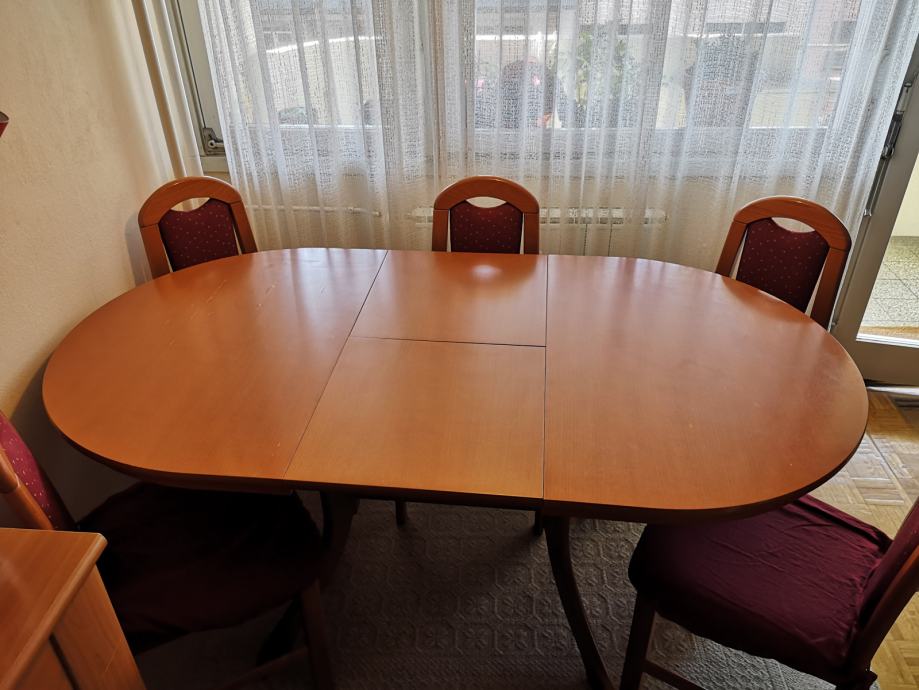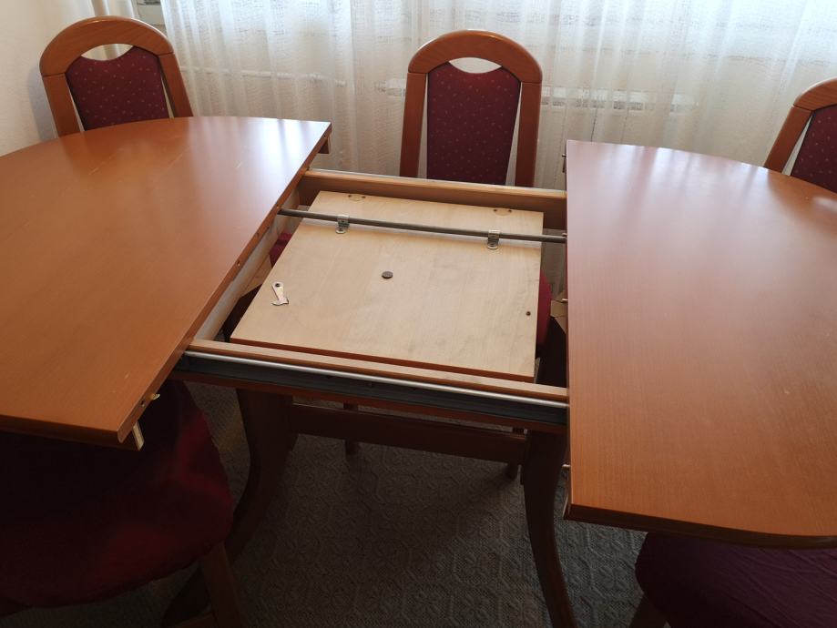 Prodamo jedilno mizo + 6 pripadajočih stolov. Miza je dobro ohranjena in ima enostaven mehanizem, da se raztegne za dodatna dva prostora (skupno 6 oseb).