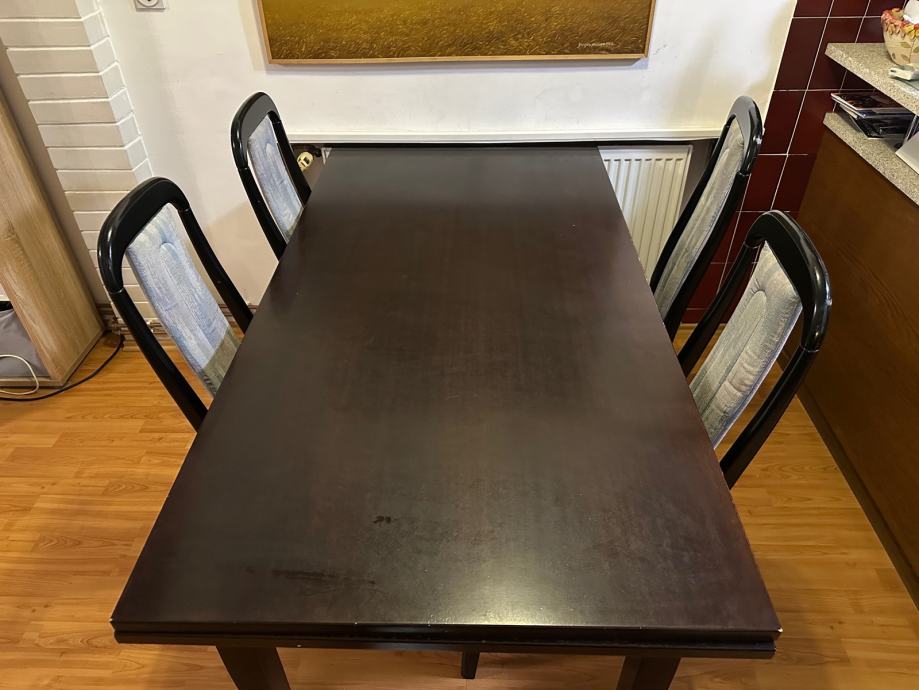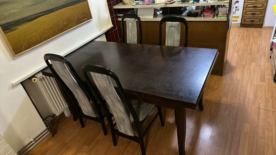 Stara jedilna miza (mere 84x160cm) z moznostjo podaljsanja. Pri stolih bi bilo potrebno obnoviti prevleke. za sedeti so super. Tudi miza ni kot nova.