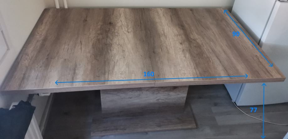 prodajam skoraj kot novo jedilno mizo dimenzij širine 90 cm višine 77 cm in dolžine 160 cm. Miza se lahko podaljša