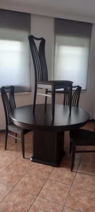 Okrogla miza fi 120 cm. Črna, lesena, raztegljiva, ohranjena, ugodno prodam za 140€. Zraven podarim še 4 oblazinjene stole.
