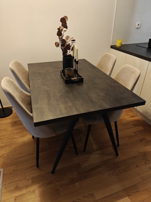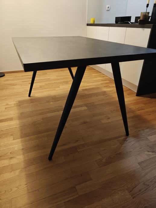 Prodajam elegantno jedilno mizo s temno površino in črnimi kovinskimi nogami. Plošča je lesena. Miza je v odličnem stanju in se popolno ujema s sodobnim interierjem.