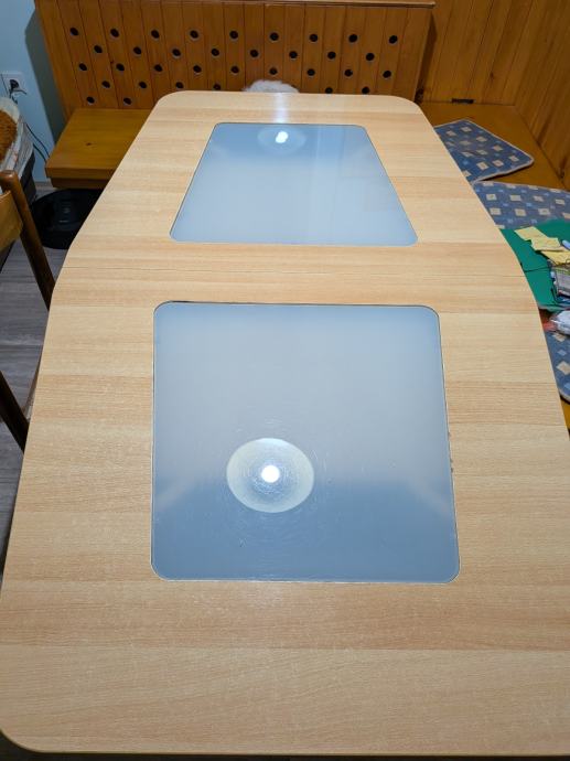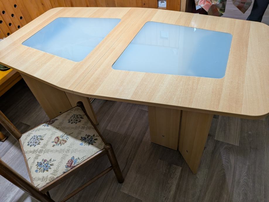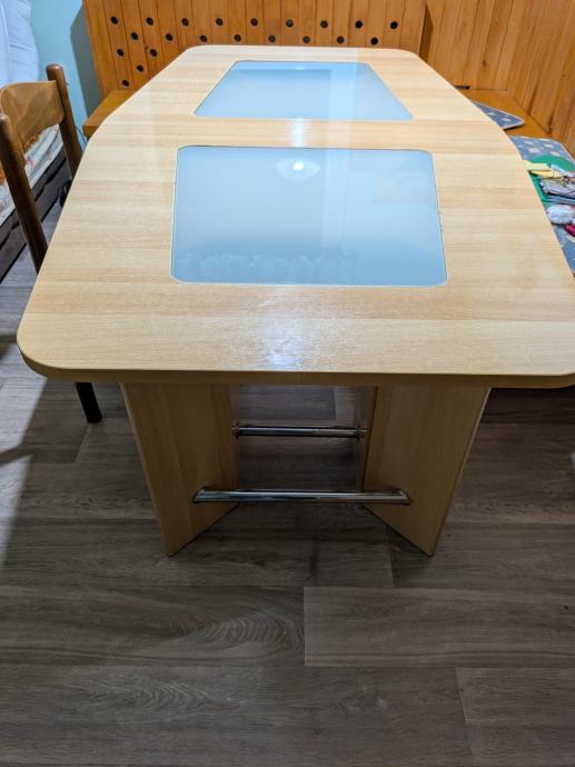 Prodajam rabljeno jedilno mizo iz lesa z edinstvenimi modrimi steklenimi vstavki. Miza je v dobrem stanju in ima praktično, stabilno zasnovo z robustnim lesenim podnožjem. Primerna je za družinsko jedilnico ali kuhinjo, kjer bi lahko služila kot osrednji kos pohištva. Za več info na 031358409