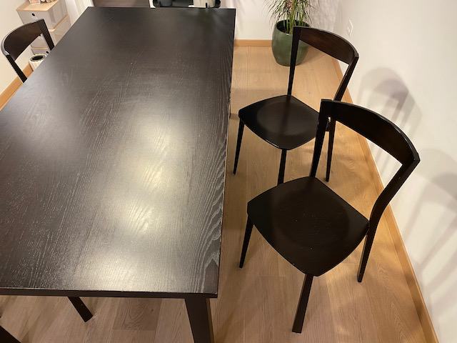Dimenzija jedilne mize je 180x90 cm. Komplet je v barvi wenge (temno rjava). Miza je dobro ohranjena in ima le minimalne znake uporabe. Stoli so še uporabni, vendar bi jih bilo priporočljivo na nekaterih mestih dodatno ojačati, saj ponekod nekoliko odstopa spoj med sediščem in hrbtnim delom.