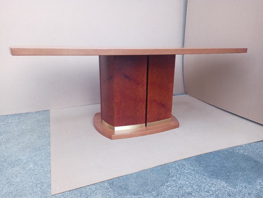 Prodam jedilno mizo dimenzij 202 x 90 x 76 cm. Mizna plošča in podnožje je rahlo elipsaste oblike. Podnožje furnirano z redkim furnirjem "Amboina" rezanim iz podzemne korenine drevesa. V spodnji rob podstavka je integrirani okrasni pas polirane kovine mesing (medenine). Miza je služila kot razstavni eksponat v vitrini.