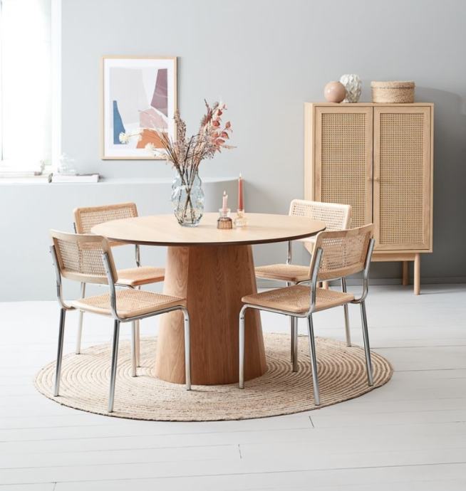 Okrogla jedilniška miza iz hrastovega furnirja, sestavljena, ni bila v uporabi. Prodam, ker mi ne paše v prostor. Ø120xV75 cm