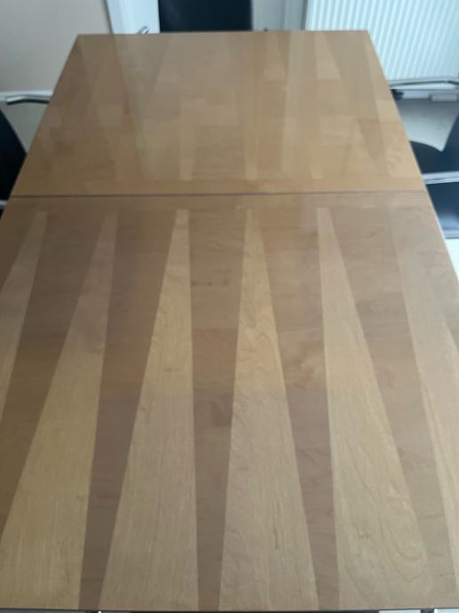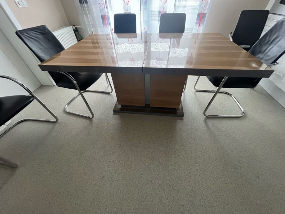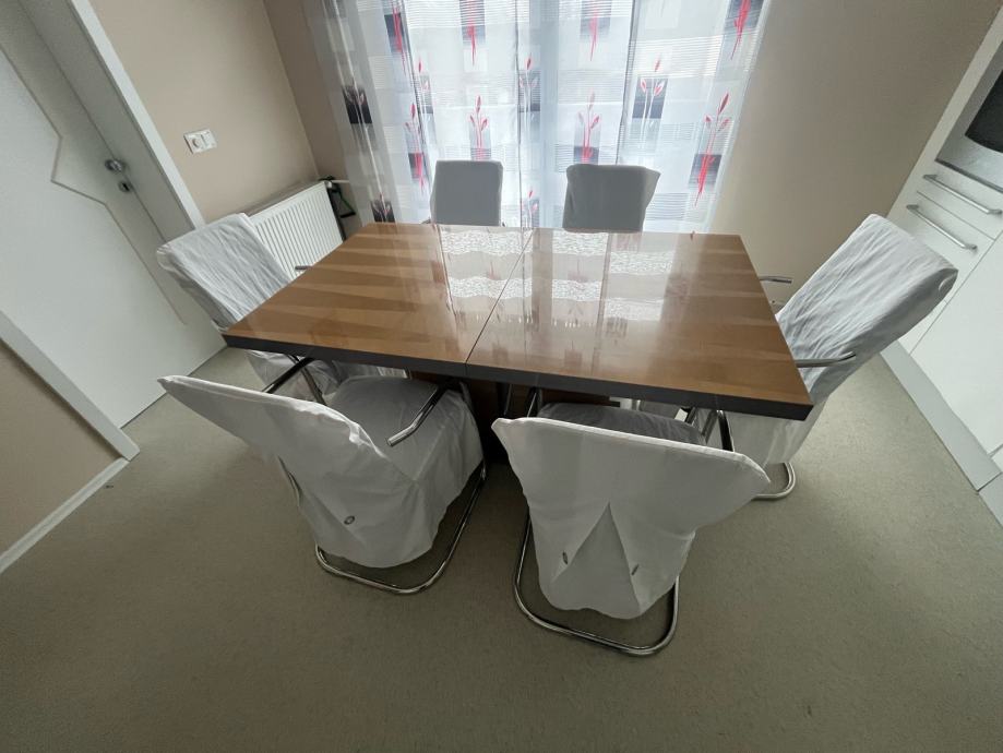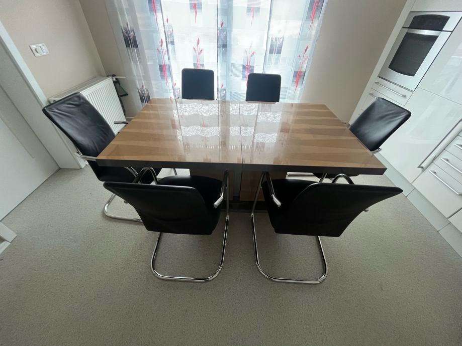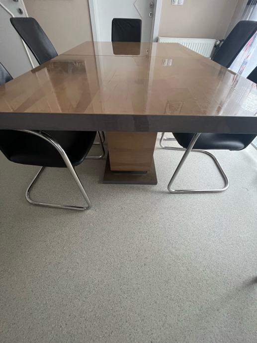Prodam jedilno mizo 160x 95 cm, s šestimi črnimi stoli v pravem usnju. Usnje je lepo ohranjeno, nikjer spokano. Dodam prevleke za stole v beli barvi.
