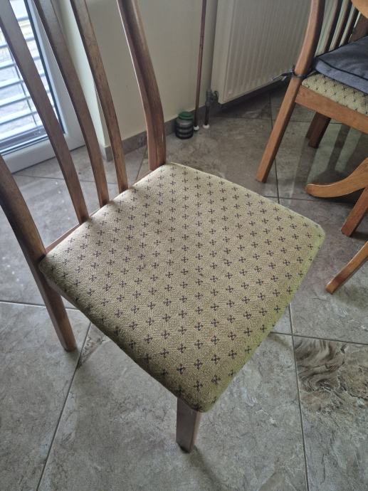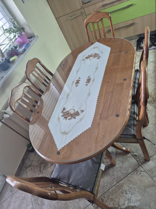 Na prodaj lesena kuhinjska miza z stoli. Miza v izvrstnem stanju brez poskodb skupaj z steklom. Mere mize 150x90. Zraven še 6stolov katerim se pozna obraba.