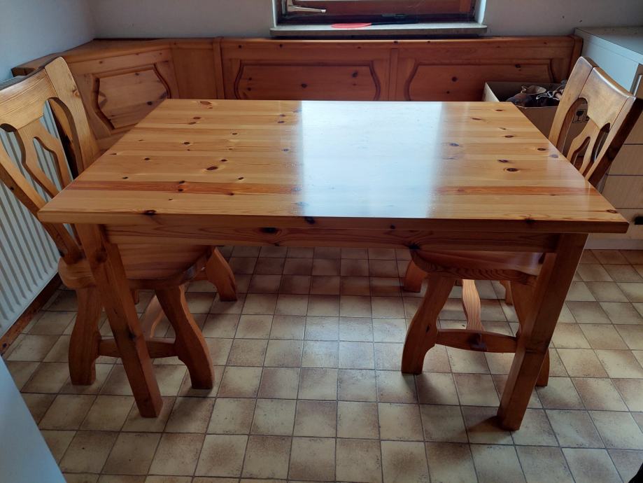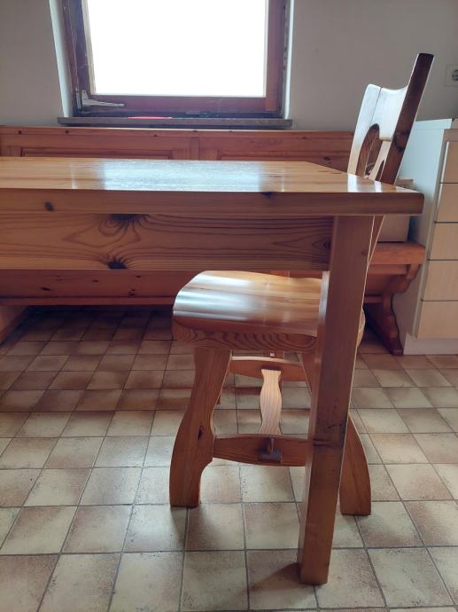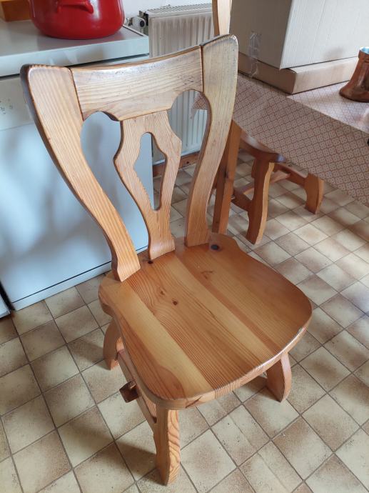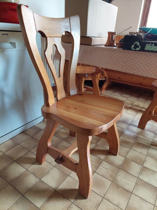 Lesena miza in 4 stoli iz masivnega lesa. Možna prodaja skupaj ali posamično. Cena je za komplet. Možen le osebni prevzem.