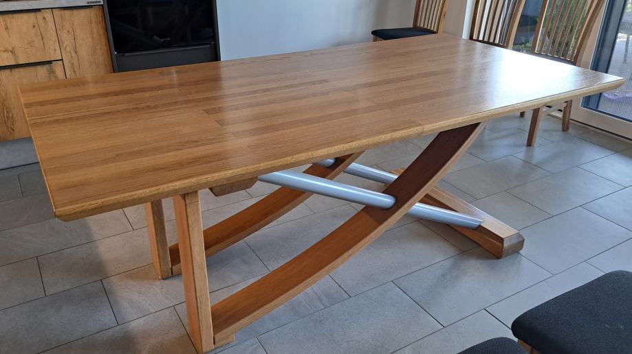Masivna hrastova miza dimenzije 2000x1000 mm. Debelina 4 cm. Izdelana pri mizarju z unikatnim podnozjem. Miza je lepo ohranjena, stara cca. 6 let.