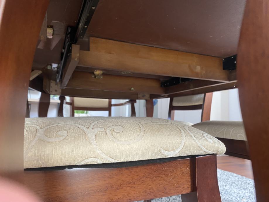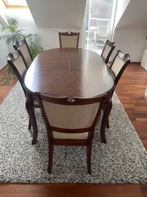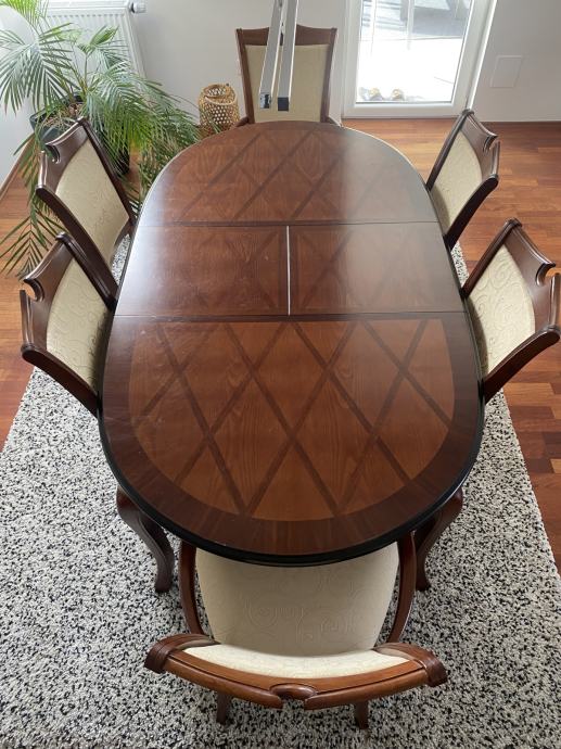 V kompletu s masivnimi lesenimi stoli ki imajo izvezene lepe vzorce ki se podajo k mizi.