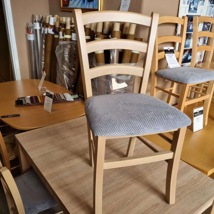 MIZA OVAL MASIVNE NOGE,KOVINSKA VODILA,PLOŠČA LAMINAT BUKEV IN 6 KOM STOL BUKEV MASIVA BARVA SONOMA TAPICIRANJE SIVO
