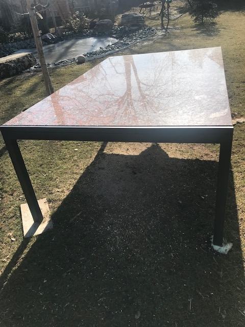 miza, kovinske noge, antracitne barve, granitna ploskev 3 cm - videz granita na sliki, kot nova, mere višina 73 cm, dolžina cca 208 cm, širina 128 cm, lahko vrtna miza ali notranja, prevzem v kranju, 041 338 082