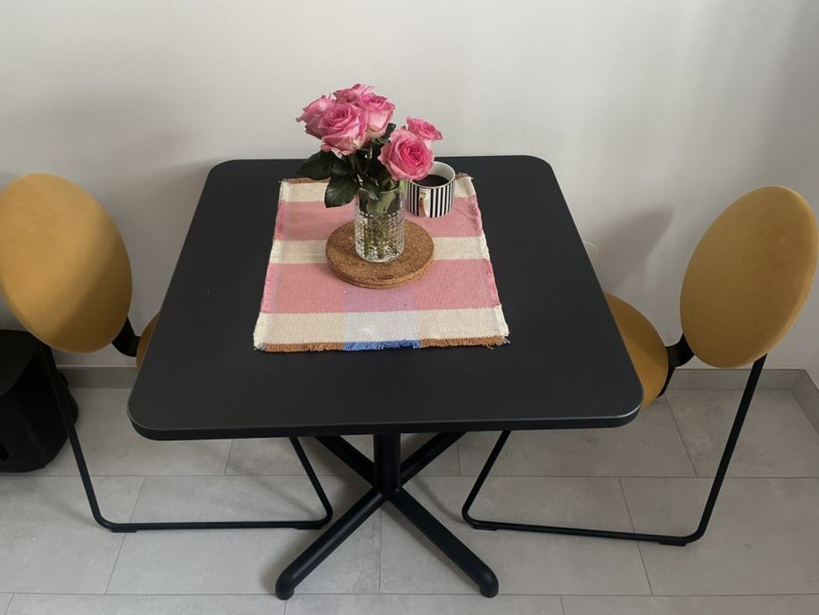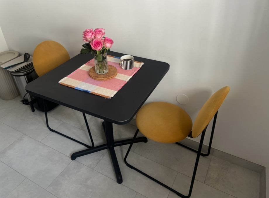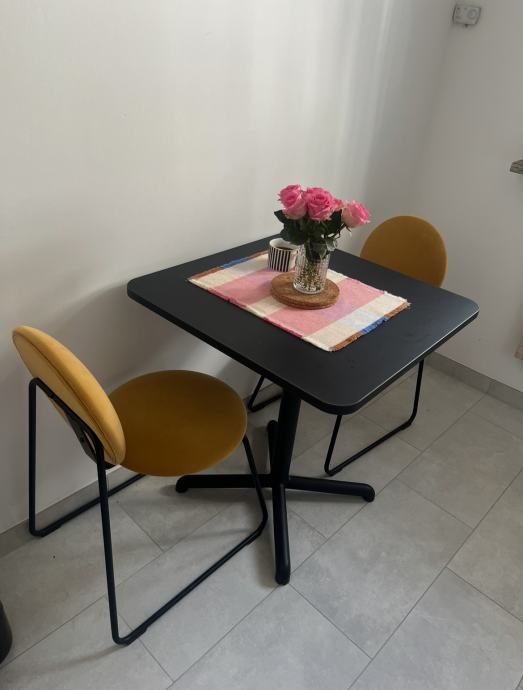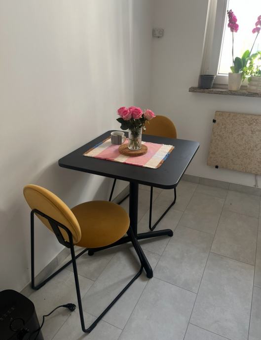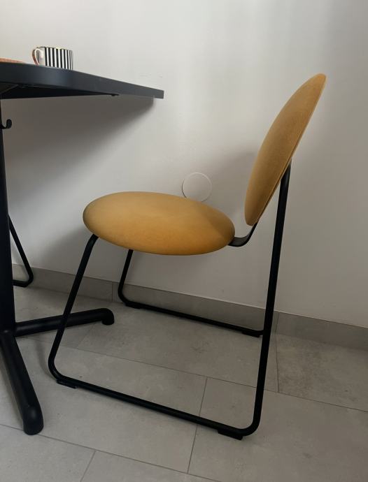 Prodajam dobro ohranjeno črno mizo iz ikee in dva stola gorčično rumene barve.