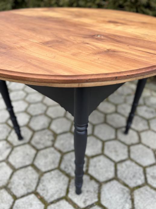 Prenovljena starinska miza, v celoti masivna, vidni znaki uporabe. Premer: 116 cm, višina: 82 cm.