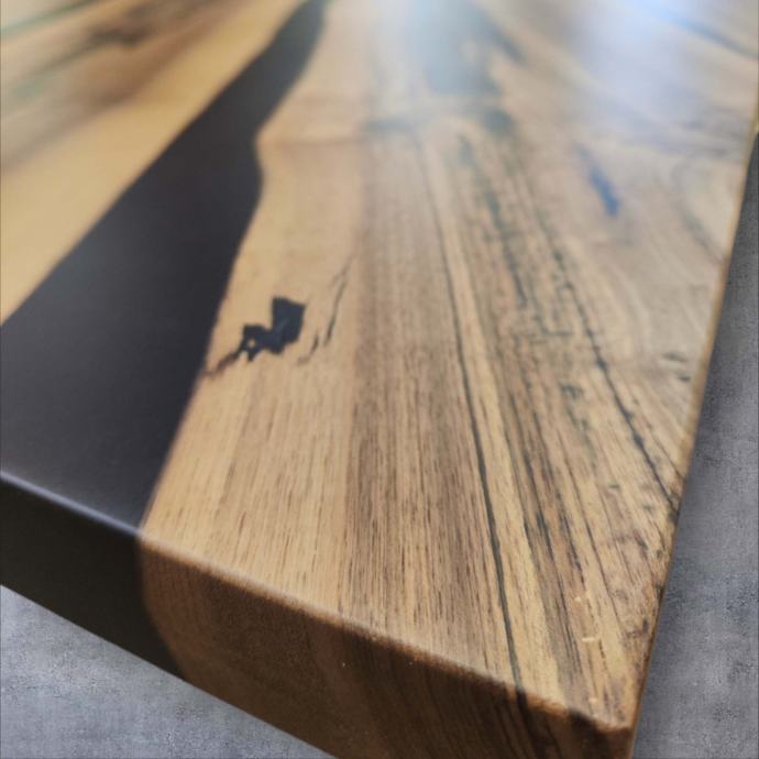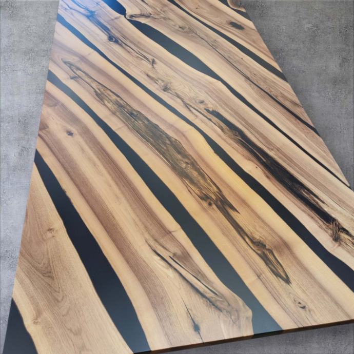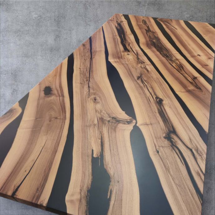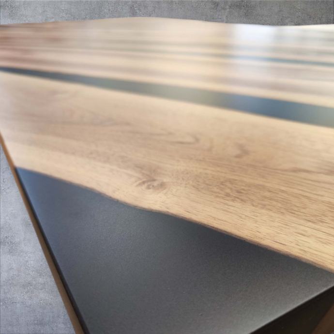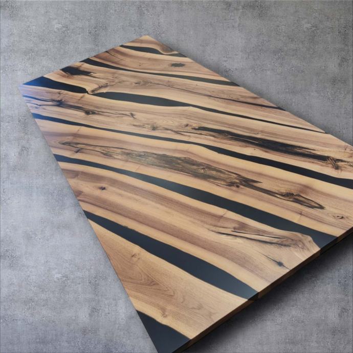 Masivna jedilna miza iz lepljene plošče evropski oreh z dodatkom epoksi smole.