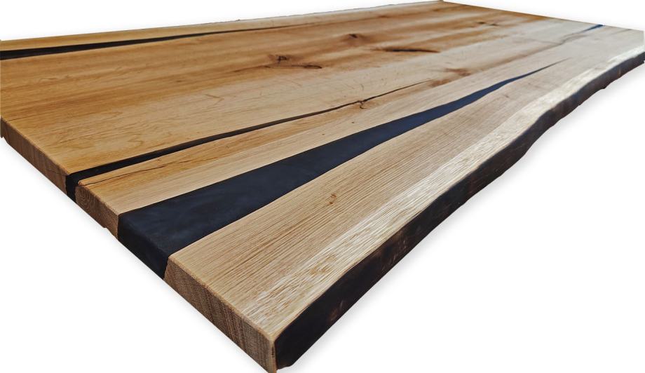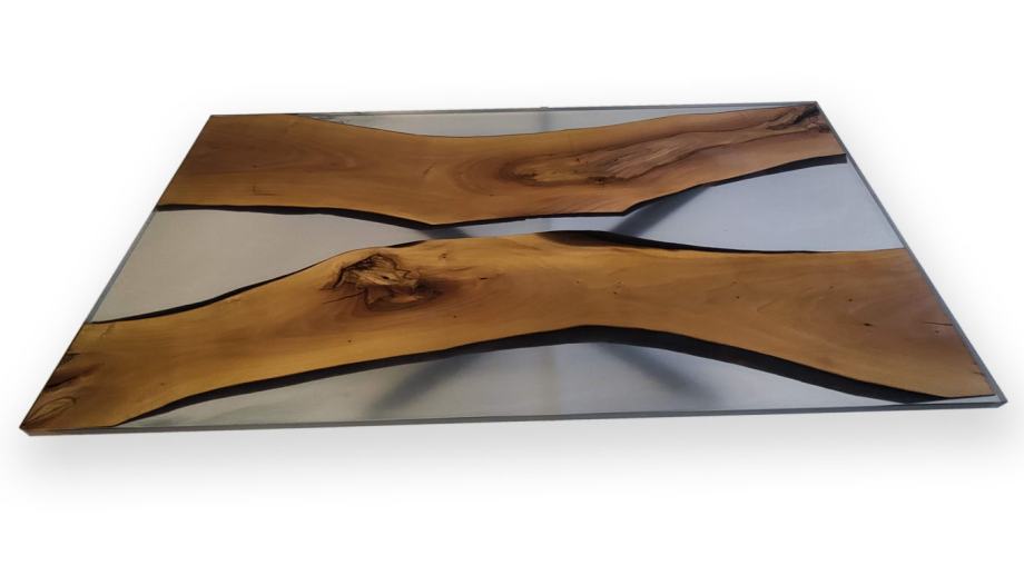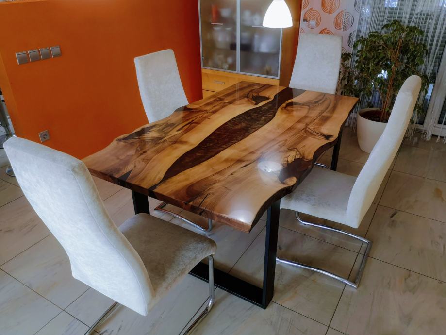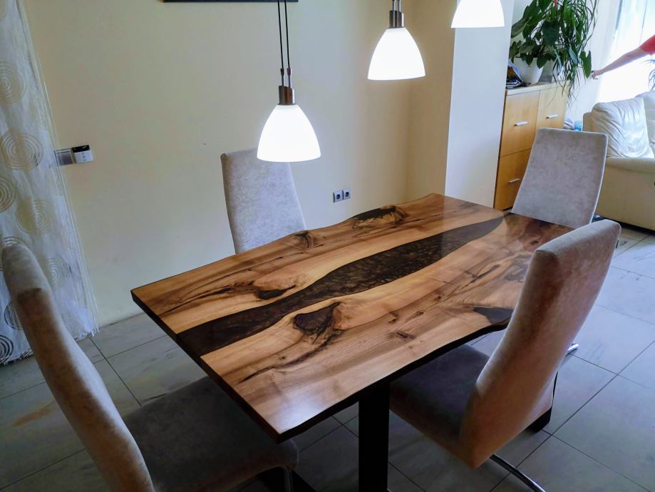 Unikatna orehova mizna plošča z dodatkom epoksi smole, prozorn. Plošča je končno obdelana in lakirana. Možnost izbire vseh podnožij.