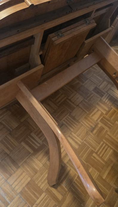 Na jedilni površini vidna obraba (manjše vdrtine, obrabljen zaščitni lak), drugače pa dobro ohranjena.