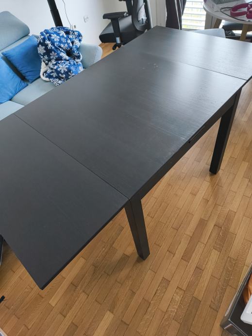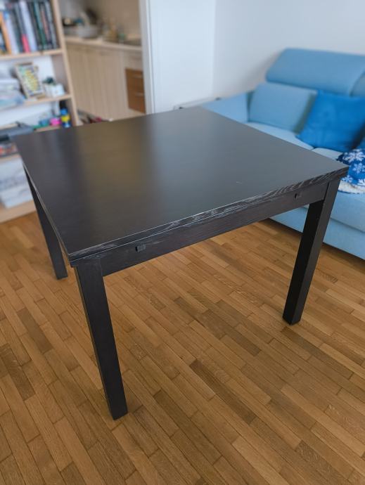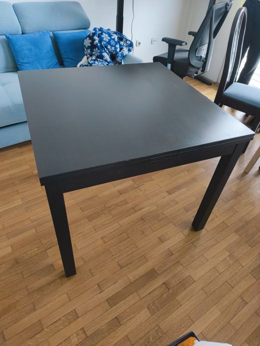 Prodam črno leseno mizo za štiri osebe. Miza je kvadratne oblike (90 cm x 90 cm) in se po potrebi lahko raztegne (170 cm x 90 cm).