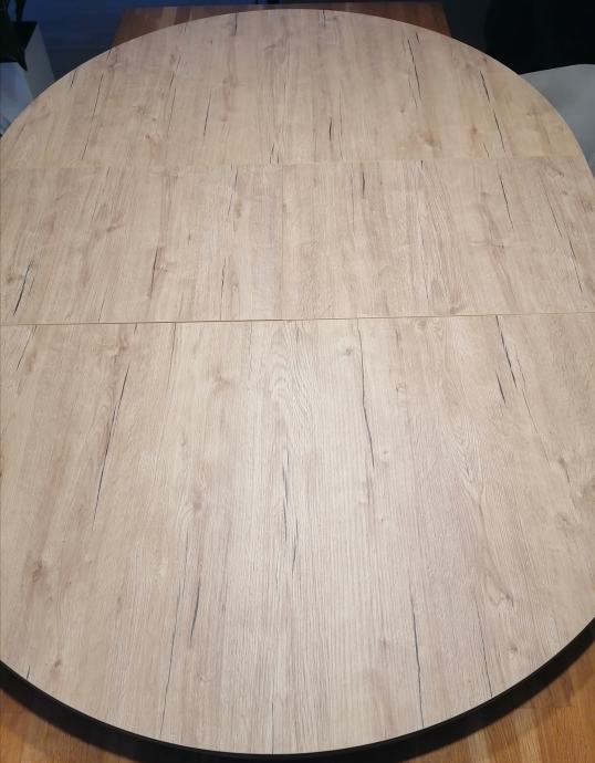 Prodam NOVO raztegljivo okroglo mizo Emma podjetja Mobili Fiver. Premer 120 cm, raztegnjena 120 x 160 cm. Žal barva nikakor ne paše k preostalemu lesu v hiši, zato je niti nismo sestavili. Drugače je miza res lepa in brezhibno izdelana, v garanciji 2 leti. Nameravam jo vrniti, še prej pa objavljam tu - morda bo komu zanimiva. Prva fotografija je s spleta, na drugih je prav ta miza oz. vzorec površine. Reže so zelo vidne, ker so ploskve samo položene skupaj, ne sestavljene. Ogled v Mariboru, cena 500 evrov.