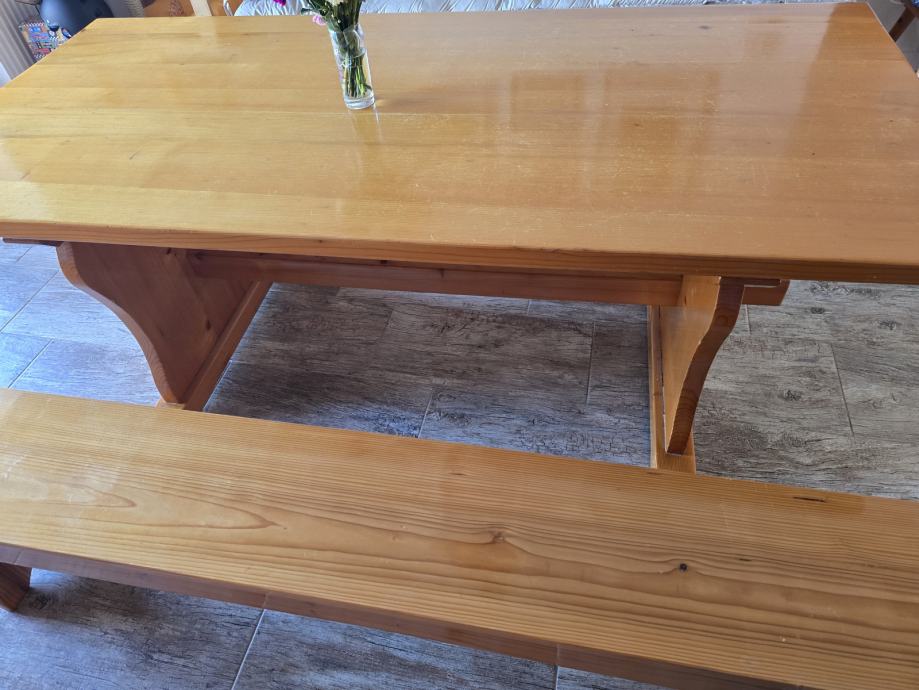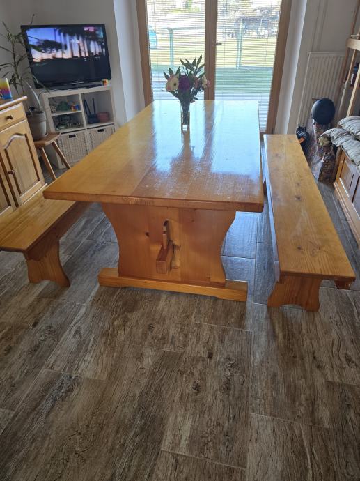 Prodam malce rabljeno masivno leseno kuhinjsko mizo v rustikalnem stilu. Poleg mize sta še dve klopi v enakem stilu. Miza se po potrebi lahko razstavi za lažji transport.