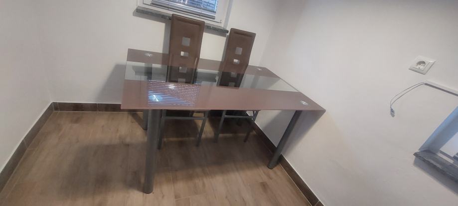Prodam stekleno jedilno mizo, dimenzije 900x140x75cm. Po želji lahko kupite tudi stole, so pa v malo slabšem stanju.