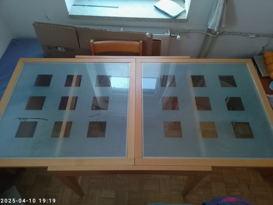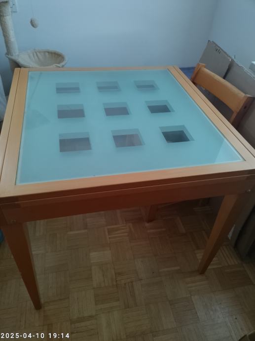 Steklena jedilna miza, dimenzije 90x90/180, višina 79. Eno steklo je malo obrabljeno (na sliki), drugace je v odličnem stanju.