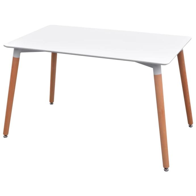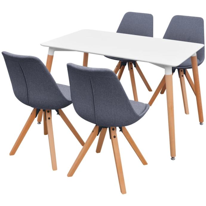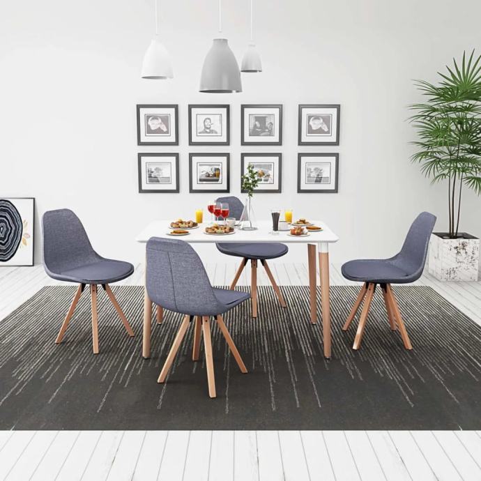 Ta 5-delni komplet pohištva za jedilnico ima trendovski videz. V vaše notranje prostore bo vnesel pridih stila. Miza in stoli za jedilnico imajo masivne noge iz bukovine, zato so zelo stabilni in vzdržljivi. Močna MDF površina mize je enostavna za čiščenje z vlažno krpo. Stol je oblečen v visokokakovostno blago, poleg tega pa je sedež podložen, kar zagotavlja dodatno udobje. Paket vsebuje 1 mizo in 4 stole za jedilnico. Montaža je zelo enostavna.