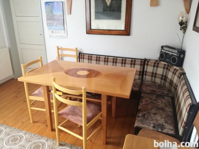 Prodam lepo ohranjen jedilni kot (miz, klopca, stoli) za apartma. Skupaj cena 400€ ali posamezno- miza 120€, 3 stoli 180€, vogalna klop z naslonom 140€, ali po dogovoru na tel: 040 240 031.