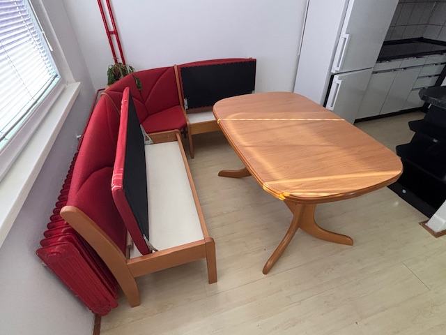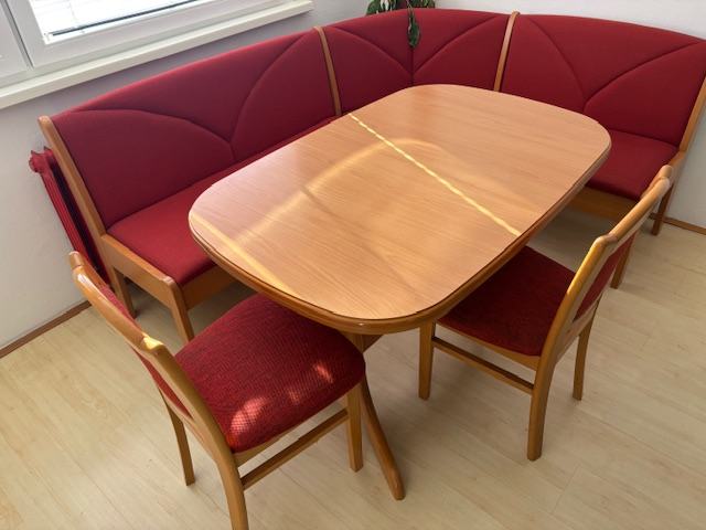 Jedilni kot iz masivnega lesa, lepo ohranjen.Klop je bila pred kratkim na novo tapecirana.