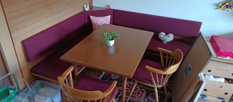 Prodam zelo lepo ohranjen masivni jedilni kot z blazinami,miza,ki se raztegne in 2 masivna stola.