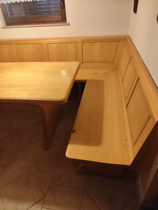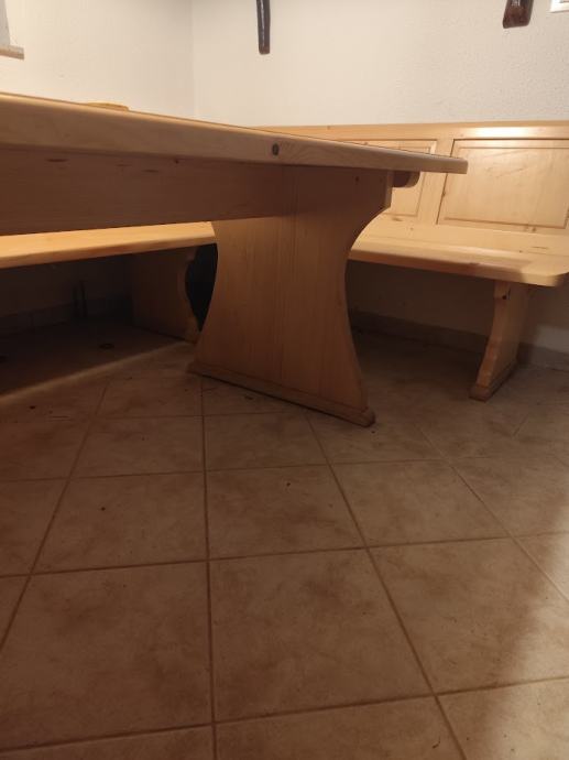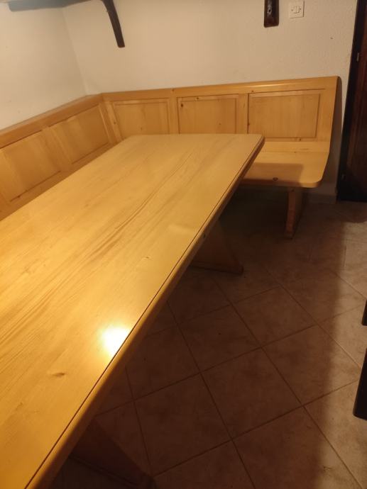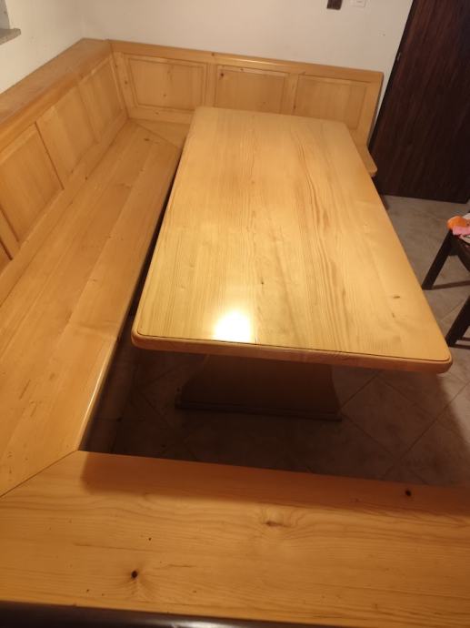 Lesena masivna klop in miza. Lakirana z lakom, malo rabljena, nepoškodovana. Klop se v vogalih deli, zaradi lažje montaže v prostor.