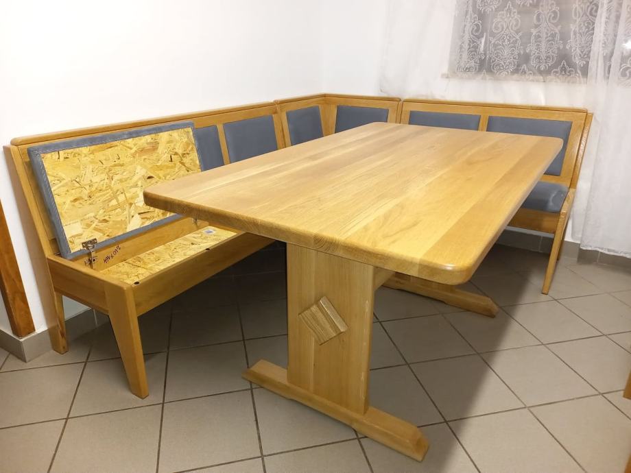 Sestav kot na sliki. Masiven les - hrast. Jedilni kot s shranjevalnimi predali pod sediščem. Oblazinjenje kot na sliki, material=mikrofibra. Ugodna cena. Cena velja za komplet.