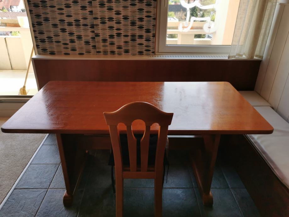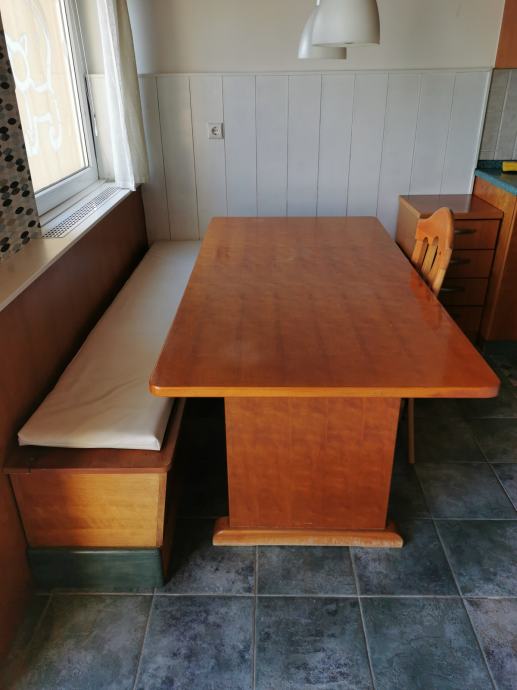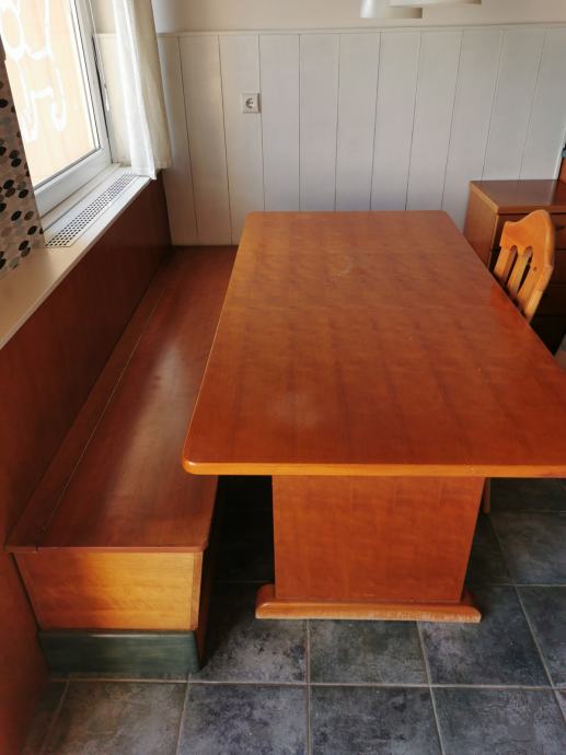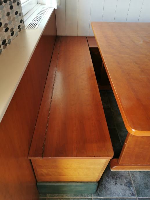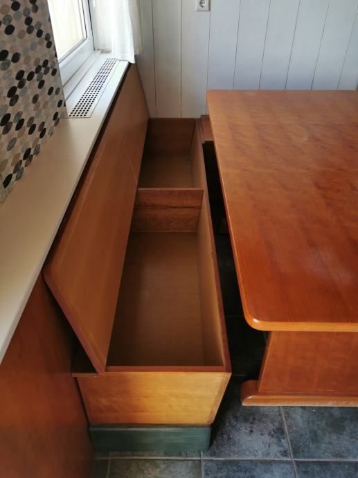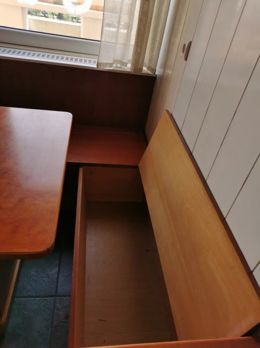 Prodam po meri narejen jedilni kot z mizo, dvemi klopmi s prostorom za shranjevanje in enim stolom.