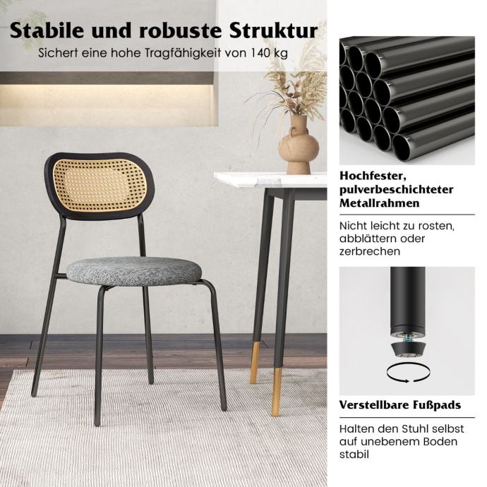Čvrsta in stabilna konstrukcija: jedilni stol iz ratana je podprt s prašno lakiranim kovinskim okvirjem visoke trdnosti, ki zagotavlja dobro stabilnost in veliko nosilnost 120 kg. Poleg tega so na dnu nastavljive podloge za noge, ki pomagajo zagotoviti, da stol ostane stabilen tudi na neravnem terenu.