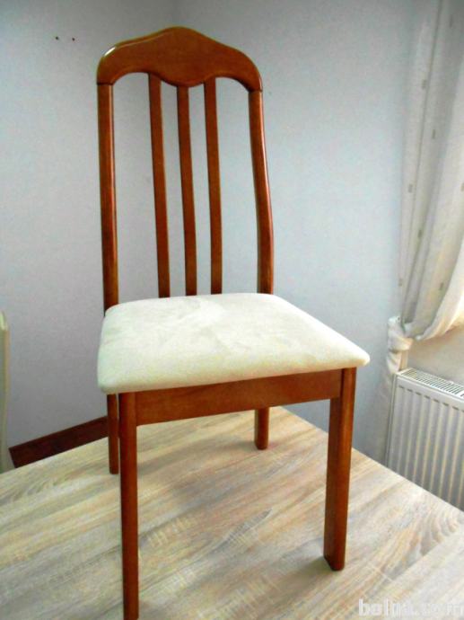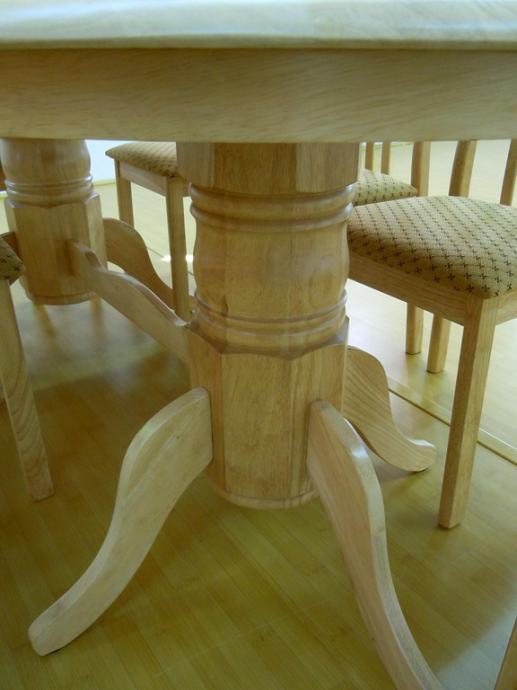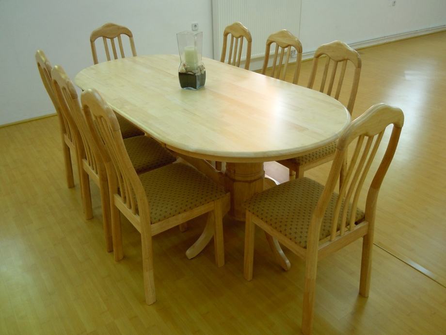 Popestrite svoj jedilni kot s klasično jedilniško garnituro iz masivnega lesa gumijevca, ki se po svojih karakteristikah (barvi, trdoti in teži) lahko primerja z našo bukvijo. Jedilna grnitura je sestavljena iz ovalne mize (200 x 100cm) in 8 stolov. Vse je sestavljivo. Na voljo v barvi natur ali češnji, oblazinjenje stolov je v kvalitetni tkanini bež barve. Stoli in miza so sestavljivi in jih je zelo lahko sestaviti. LAHKO JO PREIZKUSITE V NAŠEM SALONU!