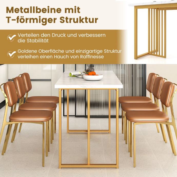 Edinstven kovinski okvir v obliki črke T: kovinske noge v obliki črke T v zlati barvi poudarjajo sodobno estetiko naše velike jedilne mize. Robusten kovinski okvir krepi celotno strukturo in izboljšuje stabilnost ter nosilnost do 150 kg.