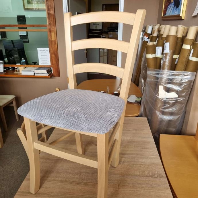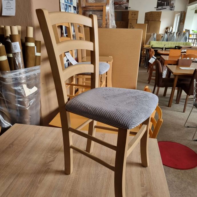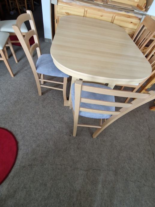 MIZA OVAL MASIVNE NOGE,KOVINSKA VODILA,PLOŠČA LAMINAT BUKEV IN 6 KOM STOL BUKEV MASIVA BARVA BUKEV TAPICIRANJE BEŠ UMETNO USNJE-LAHKO SE PRETAPICIRAJO V DRUGO BARVO IN DRUG MATERIAL