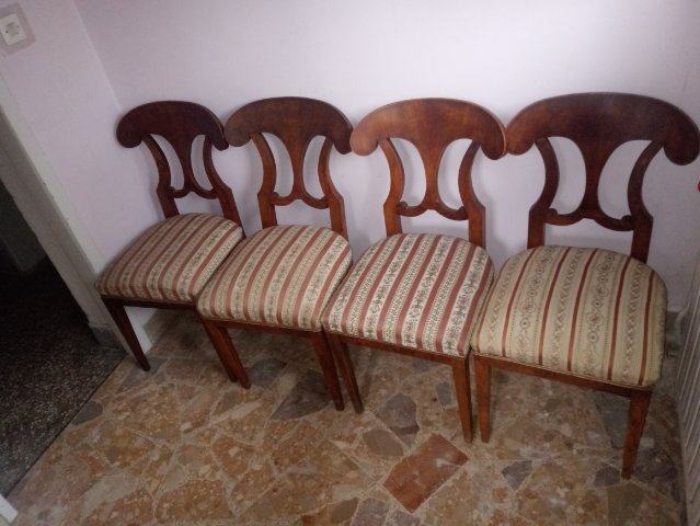 PRODAM MIZO IN ŠTIRI STOLE IZ LETA CCA 1820. MIZARSKO STABILNO, TAPETNIŠKO UREJENO, POTREBNO OSVEŽITVE, KER DOLGO NI BILO V UPORABI. PRODAM SKUPA ALI POSAMEZNO. MIZA PREMER 110 CM RAZTEGNE SE V OVAL Z DVEMA DODATKOMA PO 60 CM.