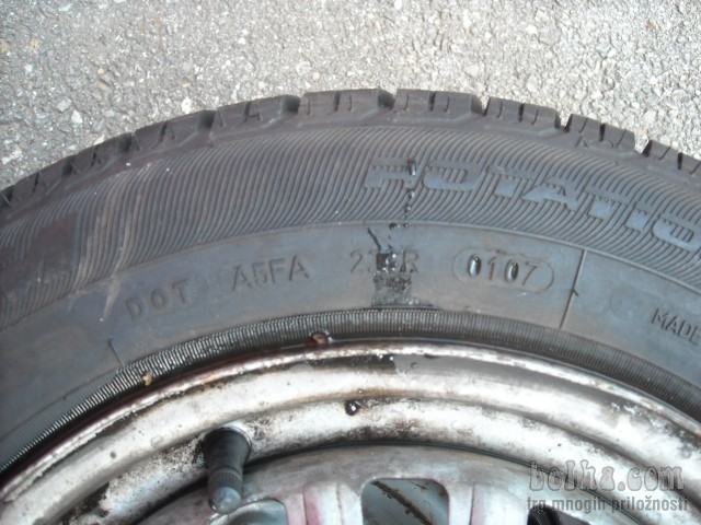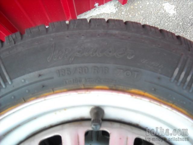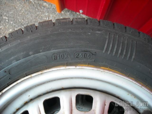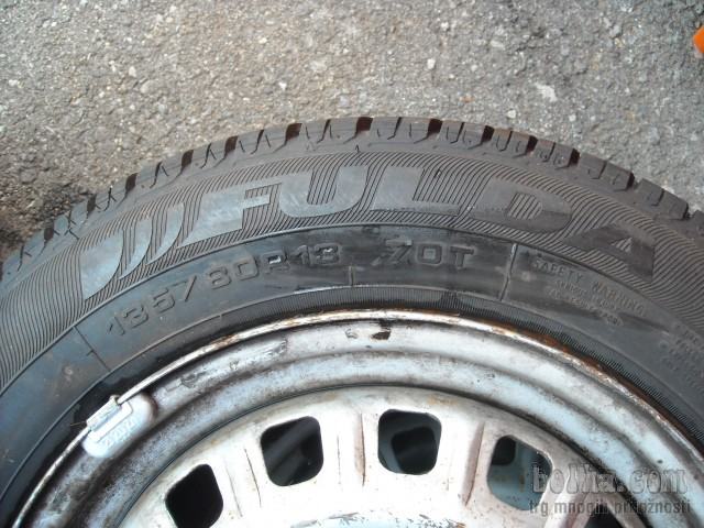 Gume na platiščih so 2x FULDA in 2x KORMORAN 135/80/13, DOT 0107 in 2404, profil 2x 6 mm in 2x 5,5 mm in je enakomerno obrabljen. Komplet bo pred predajo na novo scentriran in pripravljen za montažo na avto. Lahko tudi z kakšnimi drugimi gumami ali samo gume ali platišča...