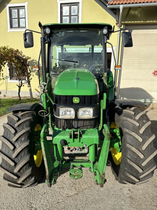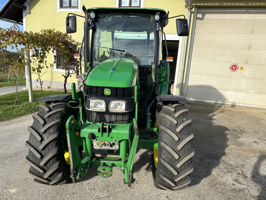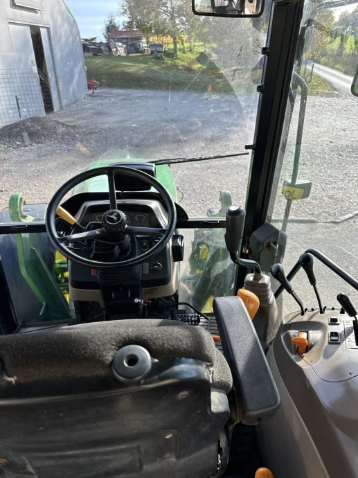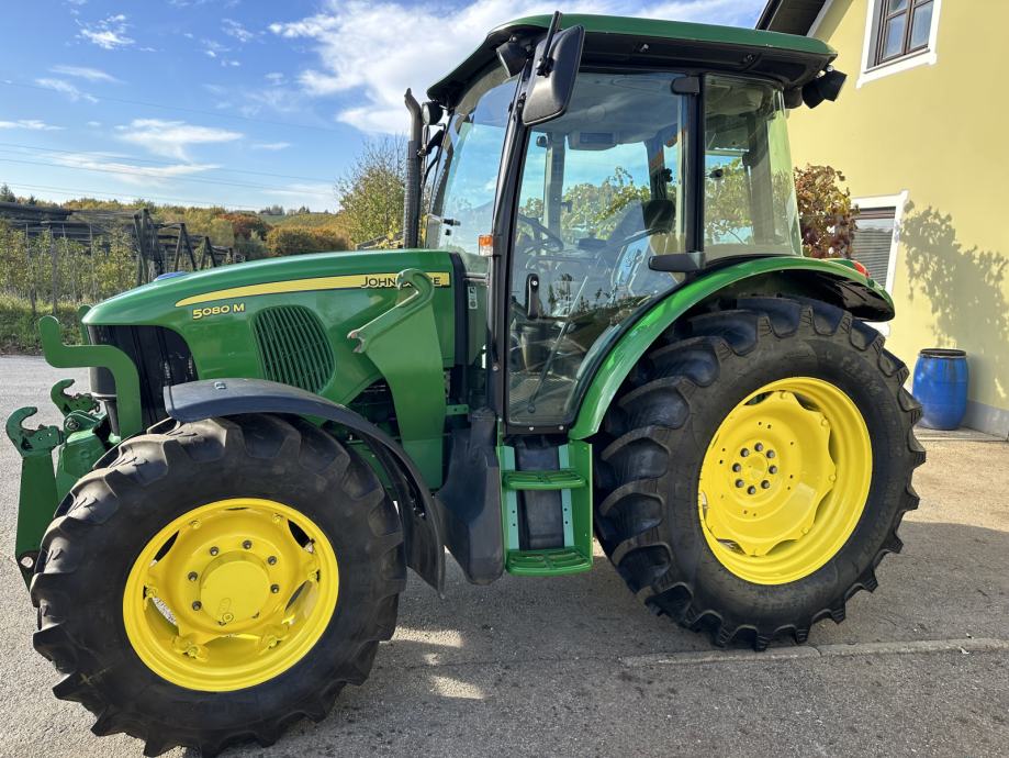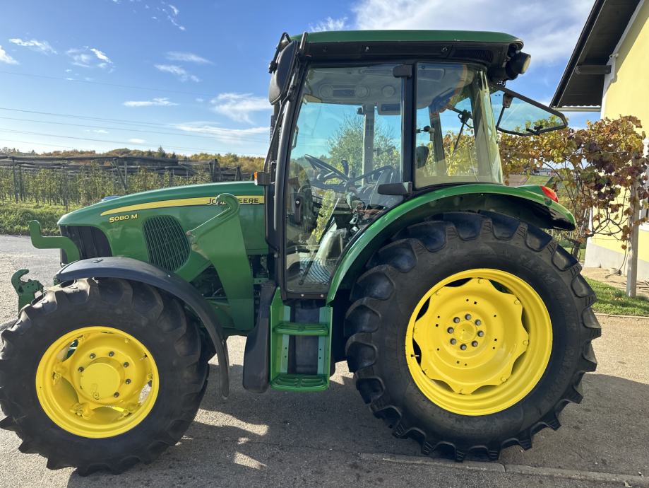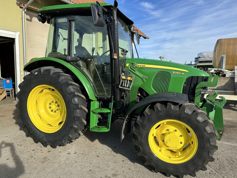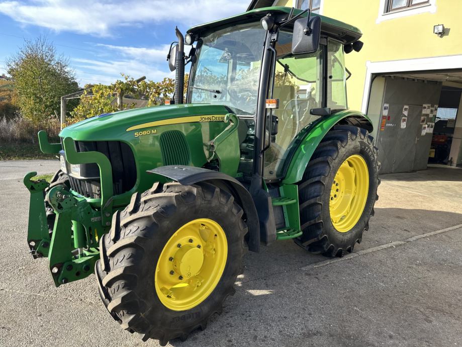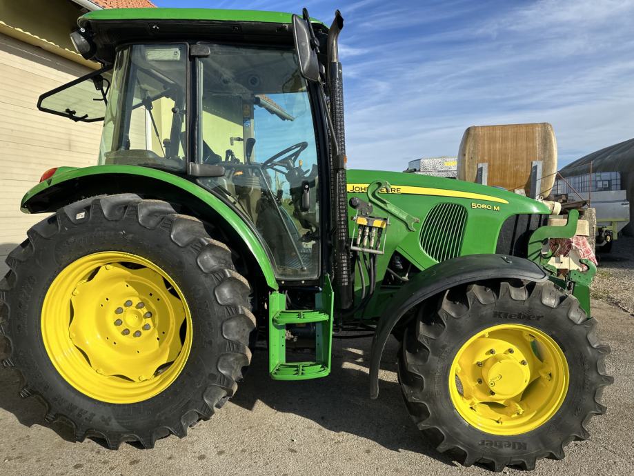 JOHN DEERE 5080 M - letnik 2010, 59 kW / 80 KM, menjalnik - PowerQuad plus 16/16, elektro invertor pri volanu, zračno vzmeten sedež, sovoznikov sedež, klima, dodatne delovne luči, 1 par hidravličnih izhodov, joystick za čelni nakladač, konzole z hidravličnim priklopom za čelni nakladač, zračne zavore za prikolico, zunanje upravljanje hidravlike, sprednja hidravlika, kompresor, hitro vpenjalne roke, 2x poteznica, 2 hidravlična priključka spredaj, komfortno ogrevana kabina, hitrosti kardana 540/540E/1000, rotacijska luč, po višini nastavljiv drsni priklop, pnevmatike 480/70R34 nove, 380/70R24 80%, sprednji blatniki, realne ure - 3.882, traktor je odlično ohranjen. Cena 31.000 € + DDV oz. 37.820 €
