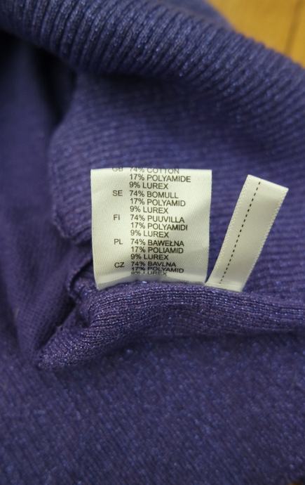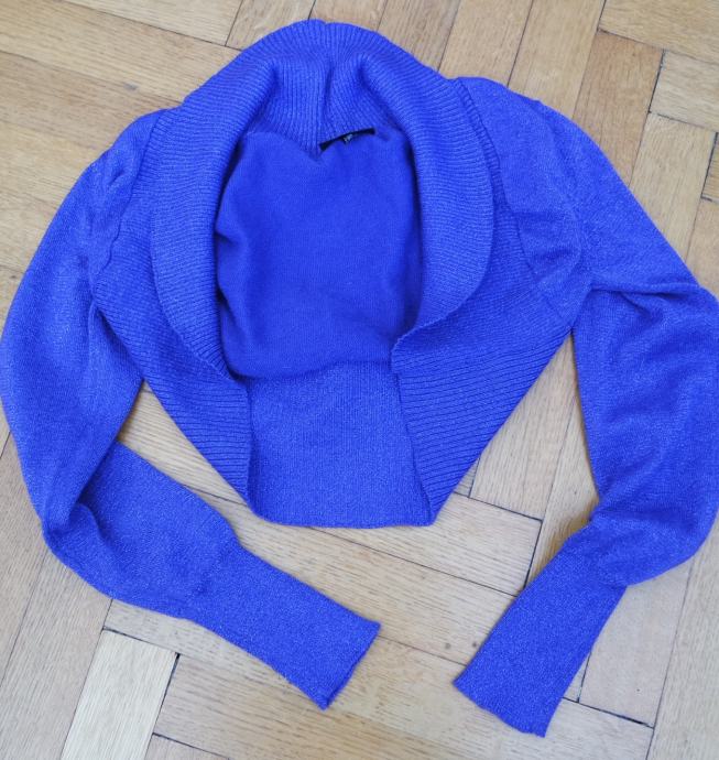 Zelo lepo ohranjen bombažni vijoličen (barva je bolj prava na 2. fotki) bolero, jopica s svetlečimi (lurex) nitkami, dolgi rokavi in šal ovratnik.