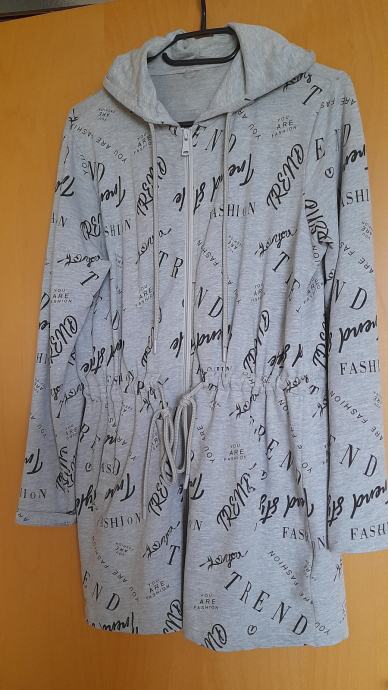 Malo nošena, je kot nova jopa s kapuco, vel. M, daljša, v pasu se z vrvico po potrebi zategne, material 95 bombaž, 5 viskoza, kupljena v Mani. Mat. se ne mucka. Meni je žal prevelika.